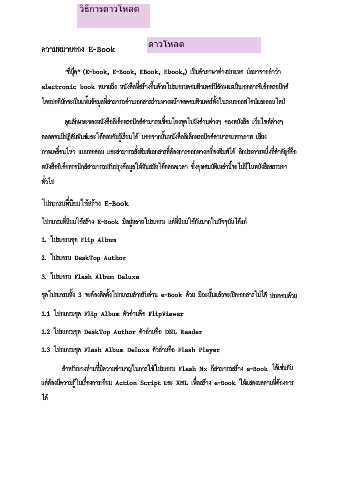 electronic book หมายถึง หนังสือที่สรางขึ้นดวยโปรแกรมคอมพิวเตอรมีลักษณะเปนเอกสารอิเล็กทรอนิกส