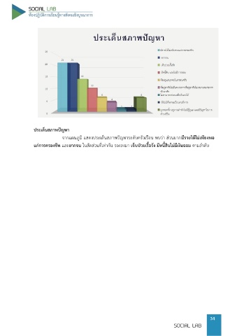 ประเด็นสภาพปัญหา จากแผนภูมิ แสดงประเด็นสภาพปัญหาระดับครัวเรือน พบว่า ส่วนมากมีรายได้ไม่เพียงพอ แก่การครองชีพ และยากจน ในสัดส่วนที่เท่ากัน รองลงมา เจ็บป่วยเรื้อรัง มีหนี้สินไม่มีเงินออม ตามล าดับ 34