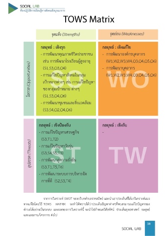 ทางแก้ไขโดยวิธี TOWS MATRIX จะท าให้ทราบได้ว่าประเด็นปัญหาต่างๆที่พบสามารถแก้ไขปัญหาของ