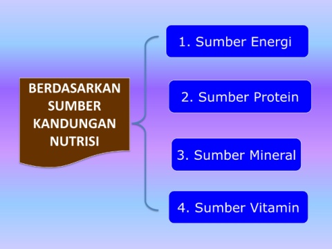 1. Sumber Energi BERDASARKAN 2. Sumber Protein SUMBER KANDUNGAN NUTRISI 3. Sumber Mineral 4. Sumber Vitamin
