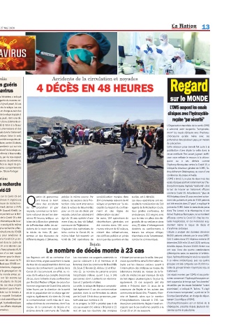 leurs voitures et motos, la majorité des Ce qui a contraint certains à se déplacer la contamination confirmée de 6 nou- tant ainsi leur nombre à 23. d’hospitalisations s’élevait à 156. Les