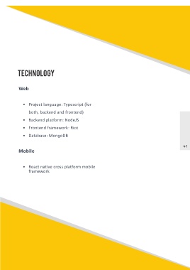 TECHNOLOGY 41 Web • Project language: Typescript (for both, backend and frontend) • Backend platform: NodeJS • Frontend framework: Riot • Database: MongoDB Mobile • React native cross platform mobile framework