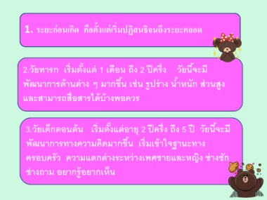 1. ระยะก่อนเกิด คือตั้งแต่เริ่มปฏิสนธิจนถึงระยะคลอด