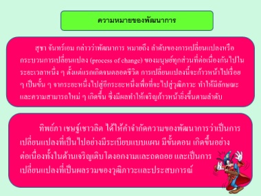 สุชำ จันทร์เอม กล่ำวว่ำพัฒนำกำร หมำยถึง ล ำดับของกำรเปลี่ยนแปลงหรือ