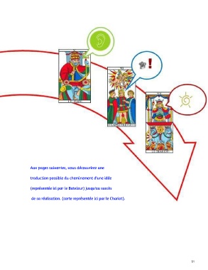 DE L' IDEE DU BATELEUR AU SUCCES DU CHARIOT ! Aux pages suivantes, vous découvrirez une traduction possible du cheminement d'une idée (représentée ici par le Bateleur) jusqu'au succès de sa réalisation. (carte représentée ici par le Chariot). 51