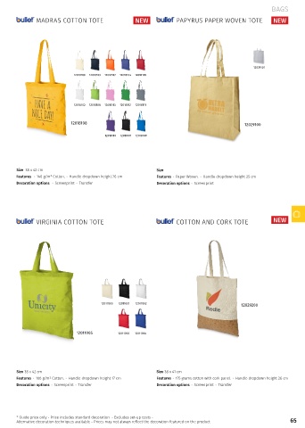 Features 100 g/m² Cotton. Handle dropdown height 17 cm Features 175 grams cotton with cork panel. Handle dropdown height 26 cm
