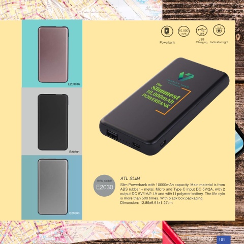 E2030 Slim Powerbank with 10000mAh capacity. Main material is from