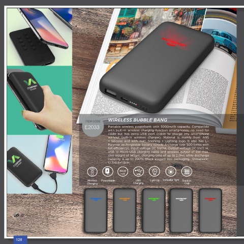 E2033 Portable wireless powerbank with 5000mAh capacity. Compatible
