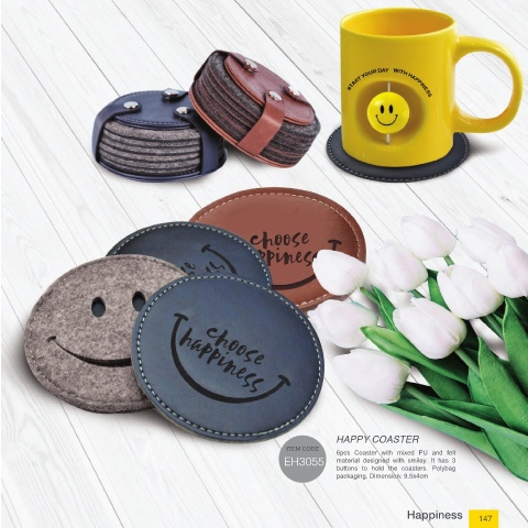 HAPPY COASTER 6pcs Coaster with mixed PU and felt EH3055 material designed with smiley. It has 3 buttons to hold the coasters. Polybag packaging. Dimension: 9.5x4cm Happiness 147 Final 2019-2_pearl2.indd 147 8/13/18 9:37 AM