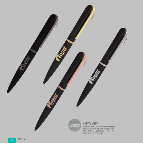 E402013 E402020 E40208 E402016 METAL PEN E4020 Stainless and ABS pen with rubberized coating, chrome clip and plating under. With polybag packaging. Blue ink. Dimension: 14.7cm length Pens 160 Final 2019-2_pearl2.indd 160 8/13/18 9:56 AM