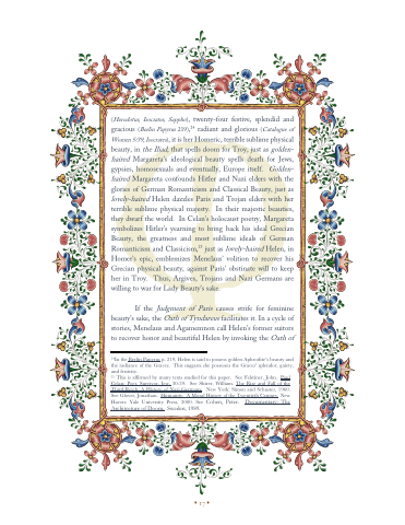 (Herodotus, Isocrates, Sappho), twenty-four festive, splendid and gracious (Berlin Papyrus 219),24 radiant and glorious (Catalogue of Women 5/39, Isocrates), it is her Homeric, terrible sublime physical beauty, in the Iliad, that spells doom for Troy, just as golden- haired Margareta’s ideological beauty spells death for Jews, gypsies, homosexuals and eventually, Europe itself. Golden- haired Margareta confounds Hitler and Nazi elders with the glories of German Romanticism and Classical Beauty, just as lovely-haired Helen dazzles Paris and Trojan elders with her terrible sublime physical majesty. In their majestic beauties, they dwarf the world. In Celan’s holocaust poetry, Margareta symbolizes Hitler’s yearning to bring back his ideal Grecian Beauty, the greatness and most sublime ideals of German Romanticism and Classicism,25 just as lovely-haired Helen, in Homer’s epic, emblemizes Menelaus’ volition to recover his Grecian physical beauty, against Paris’ obstinate will to keep her in Troy. Thus, Argives, Trojans and Nazi Germans are willing to war for Lady Beauty’s sake.
