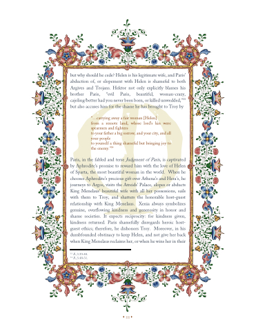 Paris, in the fabled and terse Judgment of Paris, is captivated by Aphrodite’s promise to reward him with the love of Helen of Sparta, the most beautiful woman in the world. When he chooses Aphrodite’s precious gift over Athena’s and Hera’s, he journeys to Argos, visits the Atreids’ Palace, elopes or abducts King Menelaus’ beautiful wife with all her possessions, sails with them to Troy, and shatters the honorable host-guest relationship with King Menelaus. Xenia always symbolizes genuine, overflowing kindness and generosity in honor and shame societies. It expects reciprocity: for kindness given, kindness returned. Paris shamefully disregards heroic host- guest ethics; therefore, he dishonors Troy. Moreover, in his dumbfounded obstinacy to keep Helen, and not give her back when King Menelaus reclaims her, or when he wins her in their