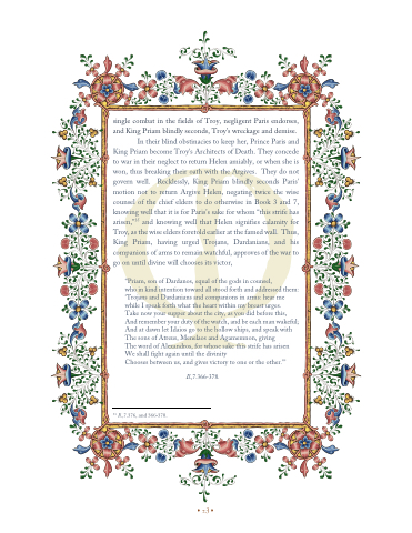 In their blind obstinacies to keep her, Prince Paris and King Priam become Troy’s Architects of Death. They concede to war in their neglect to return Helen amiably, or when she is won, thus breaking their oath with the Argives. They do not govern well. Recklessly, King Priam blindly seconds Paris’ motion not to return Argive Helen, negating twice the wise counsel of the chief elders to do otherwise in Book 3 and 7, knowing well that it is for Paris’s sake for whom “this strife has arisen,”35 and knowing well that Helen signifies calamity for Troy, as the wise elders foretold earlier at the famed wall. Thus, King Priam, having urged Trojans, Dardanians, and his companions of arms to remain watchful, approves of the war to go on until divine will chooses its victor,