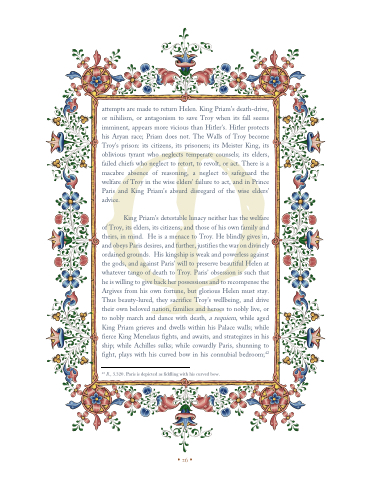 attempts are made to return Helen. King Priam’s death-drive, or nihilism, or antagonism to save Troy when its fall seems imminent, appears more vicious than Hitler’s. Hitler protects his Aryan race; Priam does not. The Walls of Troy become Troy’s prison: its citizens, its prisoners; its Meister King, its oblivious tyrant who neglects temperate counsels; its elders, failed chiefs who neglect to retort, to revolt, or act. There is a macabre absence of reasoning, a neglect to safeguard the welfare of Troy in the wise elders’ failure to act, and in Prince Paris and King Priam’s absurd disregard of the wise elders’ advice.