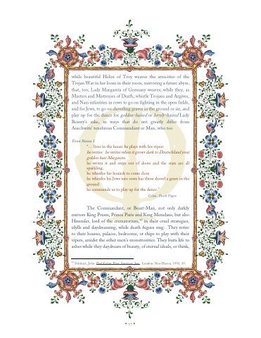 while beautiful Helen of Troy weaves the atrocities of the Trojan War in her loom in their room, mirroring a future abyss, that, too, Lady Margareta of Germany weaves; while they, as Masters and Mistresses of Death, whistle Trojans and Argives, and Nazi infantries in rows to go on fighting in the open fields, and for Jews, to go on shoveling graves in the ground or air, and play up for the dance for golden-haired or lovely-haired Lady Beauty’s sake, in ways that do not greatly differ from Auschwitz’ tenebrous Commandant or Man, who too
