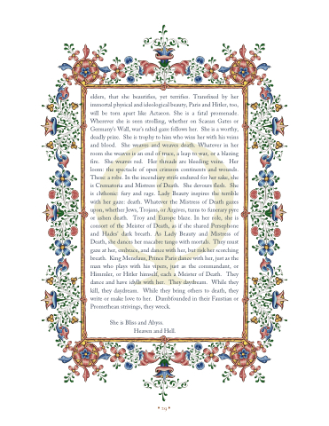 elders, that she beautifies, yet terrifies. Transfixed by her immortal physical and ideological beauty, Paris and Hitler, too, will be torn apart like Actaeon. She is a fatal promenade. Wherever she is seen strolling, whether on Scaean Gates or Germany’s Wall, war’s rabid gaze follows her. She is a worthy, deadly prize. She is trophy to him who wins her with his veins and blood. She weaves and weaves death. Whatever in her room she weaves is an end of truce, a leap to war, or a blazing fire. She weaves red. Her threads are bleeding veins. Her loom: the spectacle of open crimson continents and wounds. These: a robe. In the incendiary strife endured for her sake, she is Crematoria and Mistress of Death. She devours flesh. She is chthonic: fury and rage. Lady Beauty inspires the terrible with her gaze: death. Whatever the Mistress of Death gazes upon, whether Jews, Trojans, or Argives, turns to funerary pyre or ashen death. Troy and Europe blaze. In her role, she is consort of the Meister of Death, as if she shared Persephone and Hades’ dark breath. As Lady Beauty and Mistress of Death, she dances her macabre tango with mortals. They must gaze at her, embrace, and dance with her, but risk her scorching breath. King Menelaus, Prince Paris dance with her, just as the man who plays with his vipers, just as the commandant, or Himmler, or Hitler himself, each a Meister of Death. They dance and have idylls with her. They daydream. While they kill, they daydream. While they bring others to death, they write or make love to her. Dumbfounded in their Faustian or Promethean strivings, they wreck.