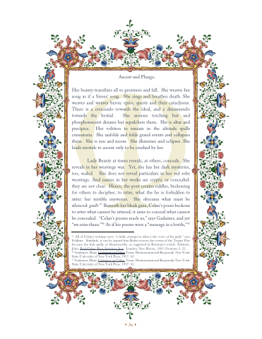 Lady Beauty at times reveals, at others, conceals. She reveals in her weavings war. Yet, she has her dark mysteries, too, sealed. She does not reveal particulars in her red robe weavings. And names in her works are cryptic or concealed: they are not clear. Hence, the poet creates riddles, beckoning for others to decipher, to utter, what the he is forbidden to utter: her terrible mysteries. She obscures what must be silenced: guilt.45 Beneath her bleak gaze, Celan’s poem beckons to utter what cannot be uttered; it aims to conceal what cannot be concealed. “Celan’s poems reach us,” says Gadamer, and yet “we miss them.”46 As if his poems were a “message in a bottle,”47