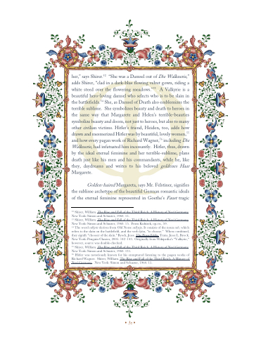 her,” says Shirer.52 “She was a Damsel out of Die Walkuerie,” adds Shirer, “clad in a dark-blue flowing velvet gown, riding a white steed over the flowering meadows.”53 A Valkyrie is a beautiful hero-loving damsel who selects who is to be slain in the battlefields.54 She, as Damsel of Death also emblemizes the terrible sublime. She symbolizes beauty and death to heroes in the same way that Margarete and Helen’s terrible-beauties symbolize beauty and doom, not just to heroes, but also to many other civilian victims. Hitler’s friend, Heiden, too, adds how drawn and mesmerized Hitler was by beautiful, lovely women,55 and how every pagan work of Richard Wagner,56 including Die Walkuerie, had infatuated him incessantly. Hitler, thus, drawn by the ideal eternal feminine and her terrible-sublime, plans death just like his men and his commandants, while he, like they, daydreams and writes to his beloved goldenes Haar Margarete.