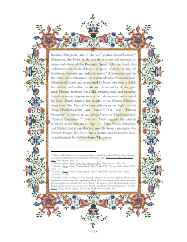 heroine, Margareta, and in Heine's57 golden-haired Lorelei.58 Margareta, like Faust, symbolizes the tensions and strivings, or storm-and-stress of the Romantic Spirit. On one hand, she emblemizes the ideals of beauty of spirit, of piety, of duty, of loveliness, of purity and industriousness59 (Classicism), and on the other, she emblemizes madness and demise (Romanticism). Demonically lured and abandoned by Faust, she bears a child; her mother and brother perish; and ostracized by all, she goes mad. Having drowned her child, awaiting trial, and rejecting Faust’s demonic impetus to save her, she repents and is saved by God. Faust’s famous last couplet in his Chorus Mysticus sings how “the Eternal Feminine/draws us on high” 3⁄4 das Ewig-Weibliche/zieht uns hinan.60 Yet this “Eternal Feminine” is related to das Ewig-Leere, or Mephistopheles’ “Eternal Emptiness.”61 Goethe’s Faust suggests the eternal feminine draws humans on high (i.e., Paris, Priam, Menelaus and Hitler), but it can also hurl mortals down a precipice: the Eternal-Empty, thus becoming a creative and destructive force as emblemized by Golden-haired Margareta.