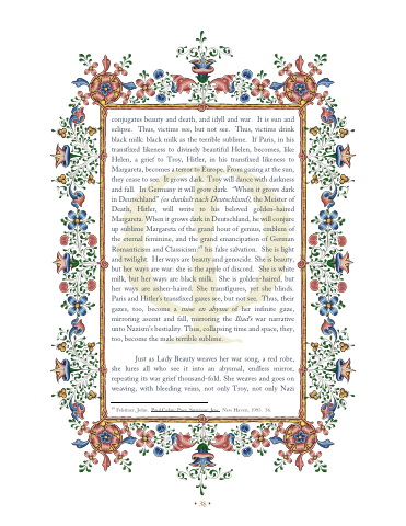 conjugates beauty and death, and idyll and war. It is sun and eclipse. Thus, victims see, but not see. Thus, victims drink black milk: black milk as the terrible sublime. If Paris, in his transfixed likeness to divinely beautiful Helen, becomes, like Helen, a grief to Troy, Hitler, in his transfixed likeness to Margareta, becomes a terror to Europe. From gazing at the sun, they cease to see. It grows dark. Troy will dance with darkness and fall. In Germany it will grow dark. “When it grows dark in Deutschland” (es dunkelt nach Deutschland), the Meister of Death, Hitler, will write to his beloved golden-haired Margareta. When it grows dark in Deutschland, he will conjure up sublime Margareta of the grand hour of genius, emblem of the eternal feminine, and the grand emancipation of German Romanticism and Classicism:69 his false salvation. She is light and twilight. Her ways are beauty and genocide. She is beauty, but her ways are war: she is the apple of discord. She is white milk, but her ways are black milk. She is golden-haired, but her ways are ashen-haired. She transfigures, yet she blinds. Paris and Hitler’s transfixed gazes see, but not see. Thus, their gazes, too, become a mise en abyme of her infinite gaze, mirroring ascent and fall, mirroring the Iliad’s war narrative unto Nazism’s bestiality. Thus, collapsing time and space, they, too, become the male terrible sublime.