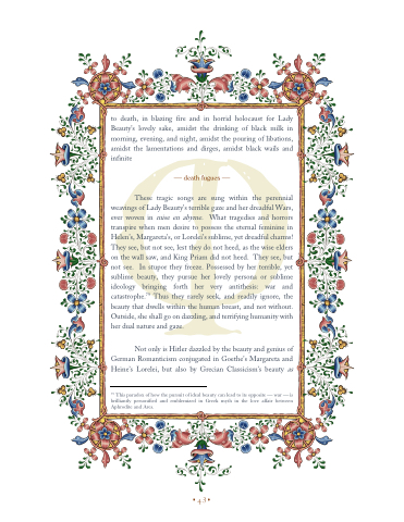 These tragic songs are sung within the perennial weavings of Lady Beauty’s terrible gaze and her dreadful Wars, ever woven in mise en abyme. What tragedies and horrors transpire when men desire to possess the eternal feminine in Helen’s, Margareta’s, or Lorelei’s sublime, yet dreadful charms! They see, but not see, lest they do not heed, as the wise elders on the wall saw, and King Priam did not heed. They see, but not see. In stupor they freeze. Possessed by her terrible, yet sublime beauty, they pursue her lovely persona or sublime ideology bringing forth her very antithesis: war and catastrophe.79 Thus they rarely seek, and readily ignore, the beauty that dwells within the human breast, and not without. Outside, she shall go on dazzling, and terrifying humanity with her dual nature and gaze.