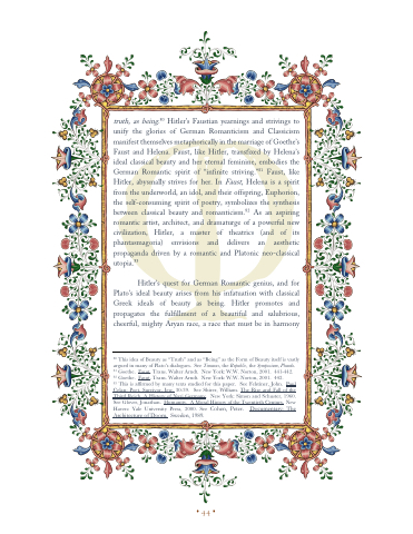 truth, as being.80 Hitler’s Faustian yearnings and strivings to unify the glories of German Romanticism and Classicism manifest themselves metaphorically in the marriage of Goethe’s Faust and Helena. Faust, like Hitler, transfixed by Helena’s ideal classical beauty and her eternal feminine, embodies the German Romantic spirit of “infinite striving.”81 Faust, like Hitler, abysmally strives for her. In Faust, Helena is a spirit from the underworld, an idol, and their offspring, Euphorion, the self-consuming spirit of poetry, symbolizes the synthesis between classical beauty and romanticism.82 As an aspiring romantic artist, architect, and dramaturge of a powerful new civilization, Hitler, a master of theatrics (and of its phantasmagoria) envisions and delivers an aesthetic propaganda driven by a romantic and Platonic neo-classical utopia.83
