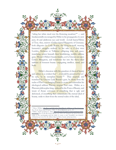 Hitler’s obsession with the grandeur of classical beauty and culture is so evident that "...it should be preserved for us”, he says, “in its exemplary beauty."86 Thus inspired, and transfixed by Grecian Lady Beauty’s gaze, he draws from the realm of Plato’s unchanging Forms to create and materialize his ideological sublime Platonic utopian Nazi state. Hitler, as a Platonist philosopher king, seduced by the Form of Beauty, and weary of Aryan corrosion, of everything that is ugly and deformed, of everything that contaminates the eternal ideal of beauty, seeks to draw from the eternal realm of the ideal,