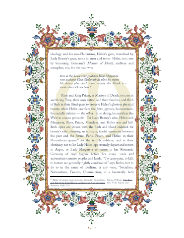 Paris and King Priam, as Masters of Death, too, err in sacrificing Troy, their own nation and their families, and flesh of flesh in their blind quest to preserve Helen’s glorious physical beauty, while Hitler sacrifices the Jews, gypsies, homosexuals, the racially inferior 3⁄4 the other. In so doing, he sacrifices the West in a mass genocide. For Lady Beauty’s sake, Helen and Margareta, Paris, Priam, Menelaus, and Hitler war and kill. Both epics are woven with the flesh and blood endured for beauty’s sake, showing an intricate, fearful symmetry between the past and the future, Paris, Priam, and Hitler, in their Promethean quests90 for the terrible sublime, and in their obstinacy not to let Lady Helen opportunely depart and return to Argos, or Lady Margareta to return to her Romantic Germany of days bygone before her many –isms and extremisms cremate peoples and lands. “To cause pain, to kill, to torture are generally rightly condemned,” says Berlin, but to do so in the name of idealism, or any –ism, “Socialism, Nationalism, Fascism, Communism, or a fanatically held