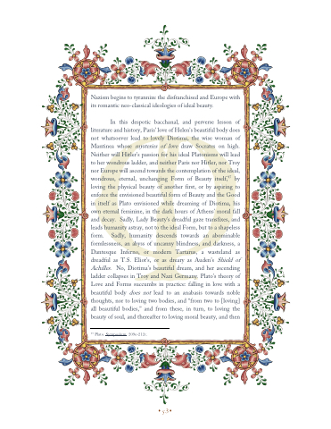In this despotic bacchanal, and perverse lesson of literature and history, Paris’ love of Helen’s beautiful body does not whatsoever lead to lovely Diotima, the wise woman of Mantinea whose mysteries of love draw Socrates on high. Neither will Hitler’s passion for his ideal Platonisms will lead to her wondrous ladder, and neither Paris nor Hitler, nor Troy nor Europe will ascend towards the contemplation of the ideal, wondrous, eternal, unchanging Form of Beauty itself,97 by loving the physical beauty of another first, or by aspiring to enforce the envisioned beautiful form of Beauty and the Good in itself as Plato envisioned while dreaming of Diotima, his own eternal feminine, in the dark hours of Athens’ moral fall and decay. Sadly, Lady Beauty’s dreadful gaze transfixes, and leads humanity astray, not to the ideal Form, but to a shapeless form. Sadly, humanity descends towards an abominable formlessness, an abyss of uncanny blindness, and darkness, a Dantesque Inferno, or modern Tartarus, a wasteland as dreadful as T.S. Eliot’s, or as dreary as Auden’s Shield of Achilles. No, Diotima’s beautiful dream, and her ascending ladder collapses in Troy and Nazi Germany. Plato’s theory of Love and Forms succumbs in practice: falling in love with a beautiful body does not lead to an anabasis towards noble thoughts, nor to loving two bodies, and “from two to [loving] all beautiful bodies,” and from these, in turn, to loving the beauty of soul, and thereafter to loving moral beauty, and then