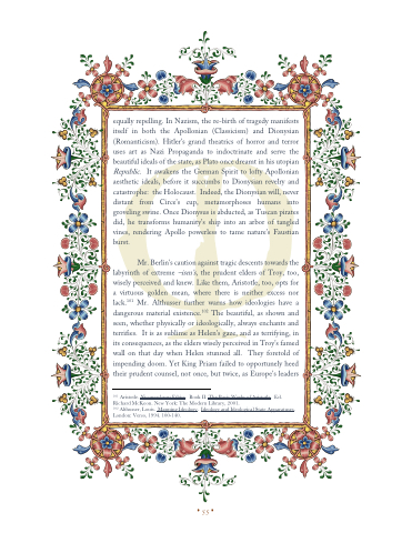 Mr. Berlin’s caution against tragic descents towards the labyrinth of extreme –ism’s, the prudent elders of Troy, too, wisely perceived and knew. Like them, Aristotle, too, opts for a virtuous golden mean, where there is neither excess nor lack.101 Mr. Althusser further warns how ideologies have a dangerous material existence.102 The beautiful, as shown and seen, whether physically or ideologically, always enchants and terrifies. It is as sublime as Helen’s gaze, and as terrifying, in its consequences, as the elders wisely perceived in Troy’s famed wall on that day when Helen stunned all. They foretold of impending doom. Yet King Priam failed to opportunely heed their prudent counsel, not once, but twice, as Europe’s leaders