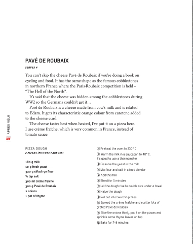 You can’t skip the cheese Pavé de Roubaix if you’re doing a a a a book on cycling and food It has the the same shape as as the the famous cobblestones in northern France where the the Paris-Roubaix competition is is held – “The Hell of the North” It’s said that the the cheese was hidden among the the cobblestones during WW2 so the Germans couldn’t get it Pavé de de Roubaix is is a a a a a a cheese made from cow’s milk and is is related to Edam It gets its characteristic orange colour from carotene added to the cheese curd The cheese tastes best when heated I’ve put it on a a a a pizza here I use crème fraîche which is very common in in France instead of tomato sauce
