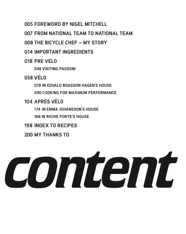 174 IN EMMA JOHANSSON’S HOUSE 188 IN RICHIE PORTE’S HOUSE 198 INDEX TO RECIPES 200 MY THANKS TO content