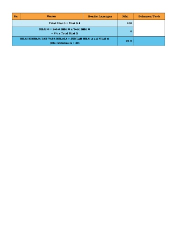 No. Uraian Kondisi Lapangan Nilai Dokumen/Tools Total Nilai G = Nilai G.1 100 NILAI G = Bobot Nilai G x Total Nilai G 4 = 4% x Total Nilai G NILAI KINERJA DAN TATA KELOLA = JUMLAH NILAI A s.d NILAI G 29.8 (Nilai Maksimum = 30)