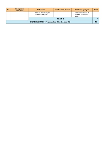 Komponen No. Indikator Jumlah dan Satuan Kondisi Lapangan Nilai Penilaian Kantor Pusat Ditjen prestasi minimal 2 Perbendaharaan periode berturut- turut Nilai B.2 0 NILAI PRESTASI = Penjumlahan Nilai B.1 dan B.2 50