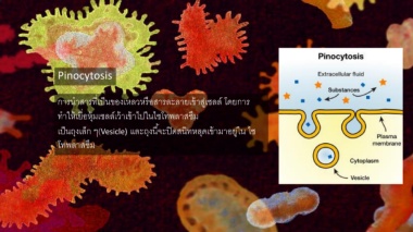 Pinocytosis การน าสารที่เป็นของเหลวหรือสารละลายเข้าสู่เซลล์ โดยการ ท าจห้เยื่อหุ้มเซลล์เว้าเข้าไปจนไซโทพลาสซึม เป็นถุงเล็ก ๆ(Vesicle) และถุงนี้จะปิดสนิทหลุดเข้ามาอยู่จน ไซ โทพลาสซึม
