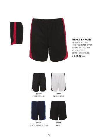 SHORT ENFANT MESH POLYESTER 100% POLYESTER EFFET RESPIRANT 150 G/M2 ref GR SO 0199 K GR 917 - NOIR / ROUGE 6-8-10-12 ans GR 935 GR 906 NOIR / BLANC BLANC / NOIR GR 534 GR 312 FRENCH MARINE / ROYAL NOIR 78 79