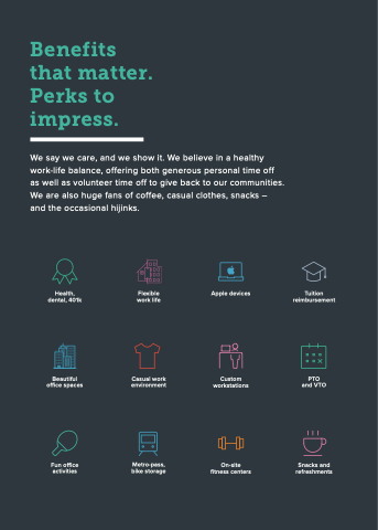 We say we care, and we show it. We believe in a healthy work-life balance, offering both generous personal time off as well as volunteer time off to give back to our communities. We are also huge fans of coffee, casual clothes, snacks – and the occasional hijinks.