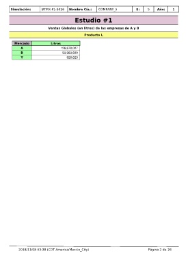 Simulación: BTMX-F1-S016 Nombre Cía.: COMPANY_5 E: 5 Año: 1 Estudio #1 Ventas Globales (en litros) de las empresas de A y B Producto L Mercado Litros A 126,678,027 B 93,963,600 Y 828,623 2018/11/08 03:38 (CDT America/Mexico_City) Página 2 de 26