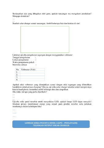 Buatlah solar charger sesuai rancangan. Ambil beberapa foto dan letakan di sini