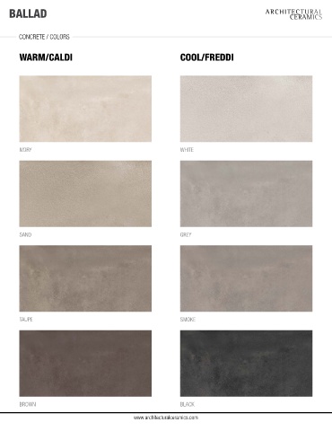 BALLAD ARCHITECTURAL CERAMICS CONCRETE / COLORS WARM/CALDI COOL/FREDDI IVORY WHITE SAND GREY TAUPE SMOKE BROWN BLACK www.architecturalceramics.com