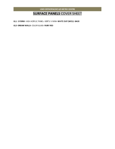 UMD ORTHOPAEDICS @ METRO CENTRE SURFACE PANELS COVER SHEET GL1- 3 FORM- HIGH ACRYLIC PANEL- VERTU V MINI- WHITE OUT (WO1)- BACK GL2- DREAM WALLS- COLOR GLASS- RUBY RED