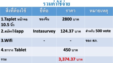 รวมค่าใช้จ่าย สิ่งที่ต้องใช้ ยี่ห้อ ราคา หมายเหตุ 1.Taplet หน้าจอ ของจีน 2800 บาท 10.5 นิ้ว 2.สมัครใช้app Instasurvey 124.37 บาท ส าหรับ 500 vote 3.Wifi - - ของ สภ. 4.ขาวาง Tablet 450 บาท รวม 3,374.37 บาท