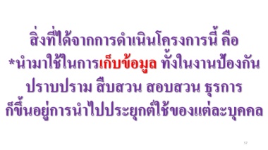 สิ่งที่ได้จากการด าเนินโครงการนี้ คือ *น ามาใช้ในการเก็บข้อมูล ทั้งในงานป้องกัน ปราบปราม สืบสวน สอบสวน ธุรการ ก็ขึ้นอยู่การน าไปประยุกต์ใช้ของแต่ละบุคคล 57