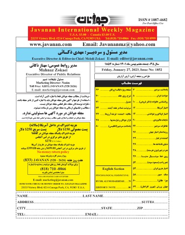 .دﻮﺸﯿﻤﻧ هدﺎﺘﺳﺮﻓ ﺲﭘ نﺎﻧاﻮﺟ ﻪﻠﺠﻣ ﻪﺑ ﯽﻟﺎﺳرا يﺎﻬﺴﮑﻋ و ﺐﻟﺎﻄﻣ • 74 .................هﺪﻨﯾآ ﻪﺘﻔﻫ رد ﺎﻤﺷ ﺖﺷﻮﻧﺮﺳ 12 ...............................................ﺎﮑﯾﺮﻣآرﺎﺒﺧا