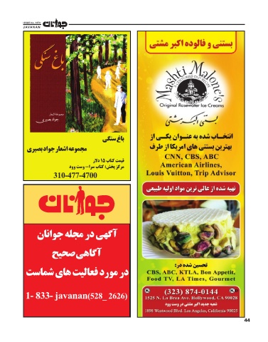 ISSUE No. 1870 JAVANAN یگنس غاب یریصب داوج راعشا هعومجم رلاد 15 باتک تمیق دوو تسو -ارس باتک :شخپ زکرم 310-477-4700 ناناوج هلجم رد یهگآ حیحص یهاگآ تسامش یاه تیلاعف دروم رد 1- 833- javanan(528_ 2626) one week 44