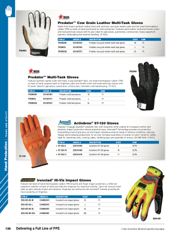 Made from brown synthetic leather back with premium cow grain leather palm and tire tread thermoplastic rubber (TPR) on back of hand and thumb for extra protection. Features grain leather reinforced thumb crotch and hook-and-loop closure with ID pad. Ideal for agriculture, automotive, construction, heavy equipment operator, landscaping and material handling. 72 Pr/Cs.