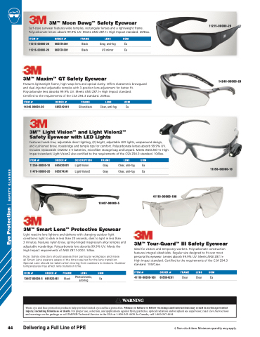 and cushioned brow, nosebridge and temple tips for comfort. Polycarbonate lenses absorb 99.9% UV. Includes replaceable CR2032 3 V batteries, microfiber storage bag and lanyard. Meets ANSI Z87.1+ High Impact standard; Light Vision2 also certified to the requirements of the CSA Z94.3 standard. 10/Box.