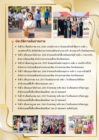 วนท 23 เดอนธนวาคม พ.ศ. 2534 บรรจรบราชการ ตําแหนงเจาหนาทธรการ ระดบ 1