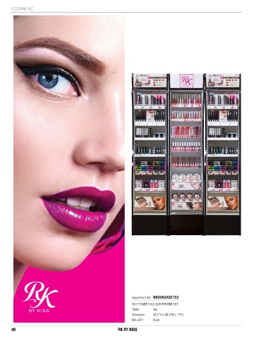 COSMETIC Assortment Set. RKD093ASET03 RK 3 TOWER FULL ASSORTMENT SET Tester Yes Dimension 68.2”H x 48.6”W x 13”D Min. QTY 1 set 40 RK BY KISS