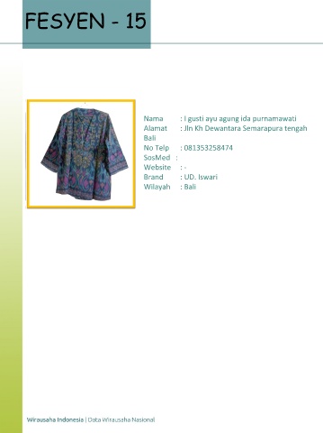 FESYEN - 15 Nama : I gusti ayu agung ida purnamawati Alamat : Jln Kh Dewantara Semarapura tengah Bali No Telp : 081353258474 SosMed : Website : - Brand : UD. Iswari Wilayah : Bali